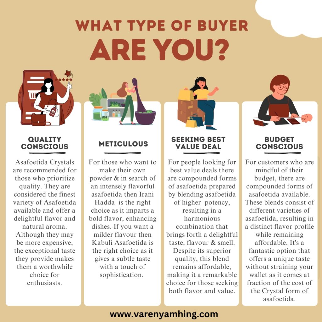 To help you find the perfect asafoetida that suits your needs, we’ve created different buyer categories, showcased in the illustration below.