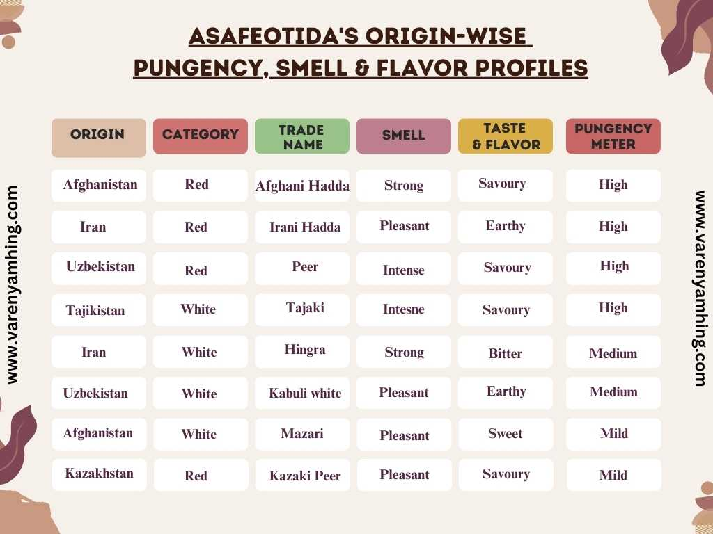 It’s worth noting that even within a single country, the taste profile, smell, and pungency of asafoetida may vary depending on the specific sourcing area. The chart provided here serves as a helpful reference for the commercially popular varieties of asafoetida only.